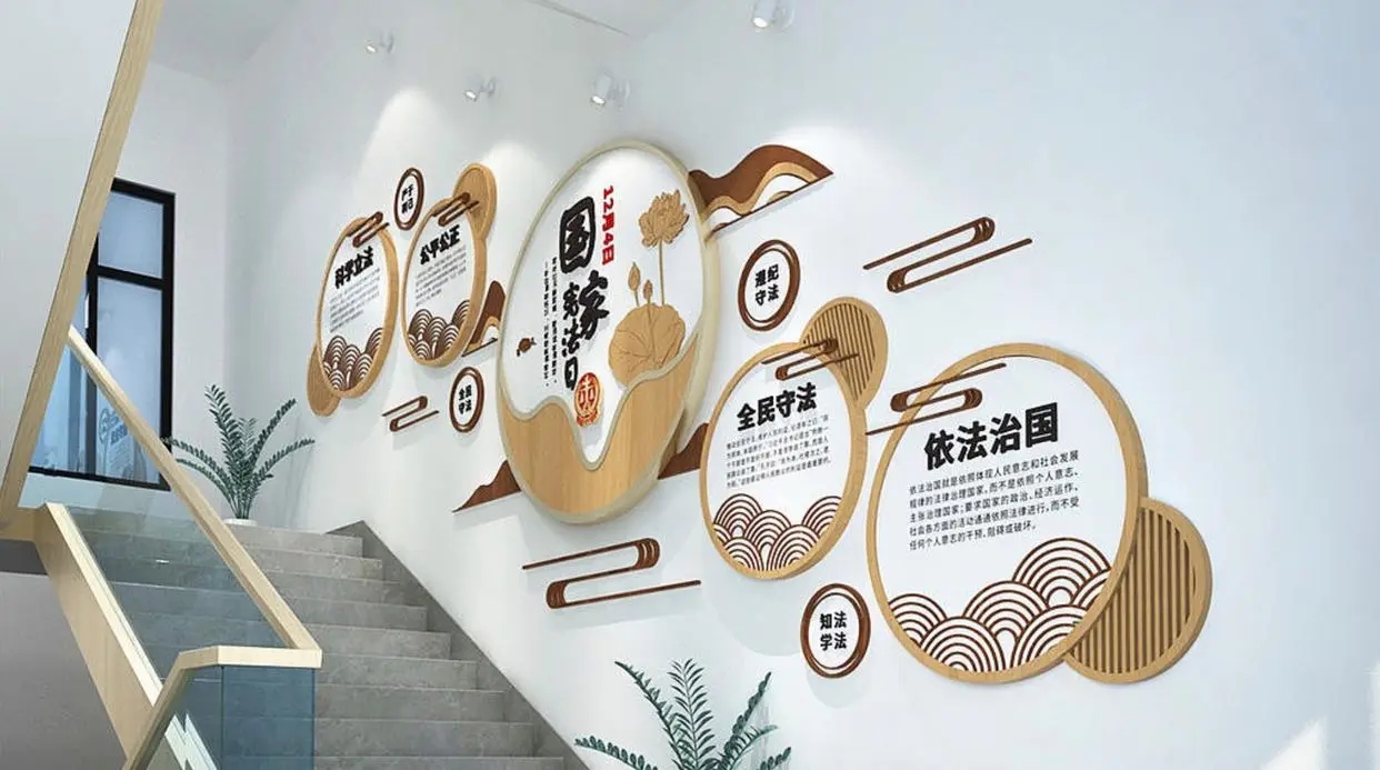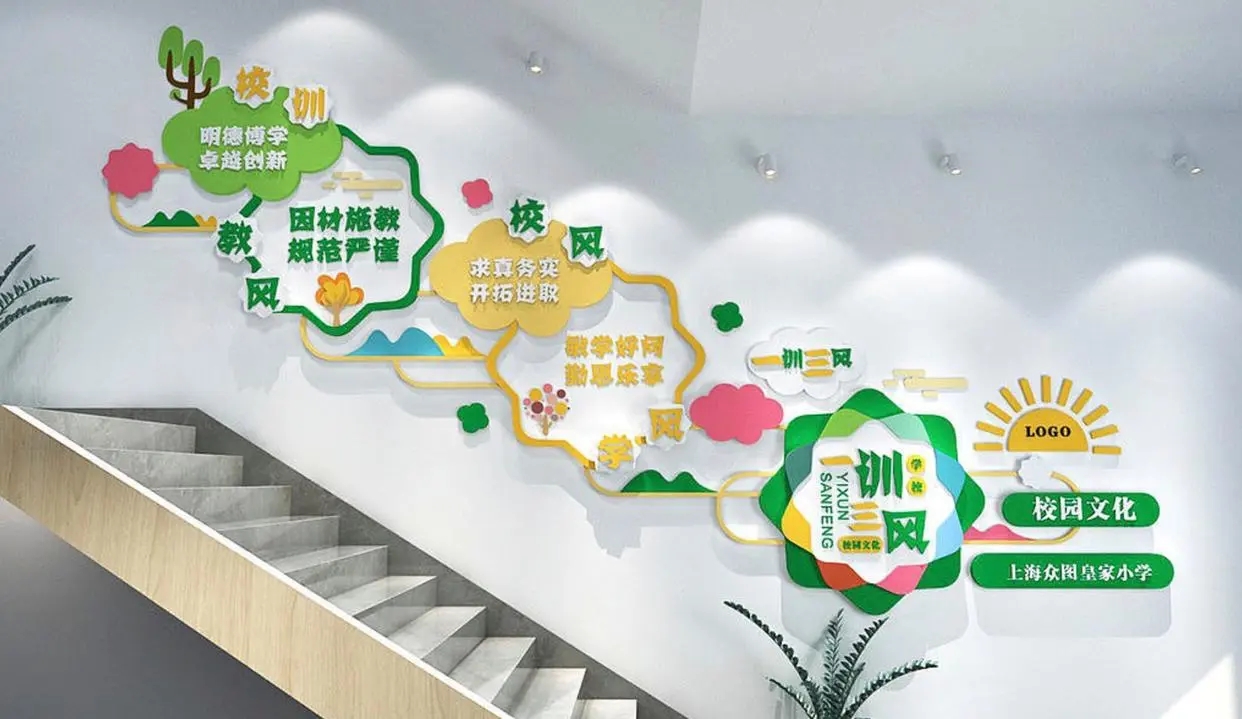 校园楼梯文化墙需凸显文化氛围,可利用书法、篆刻、卷轴等展示传统文化韵味;根据学校性质,一般幼儿园、小学等多