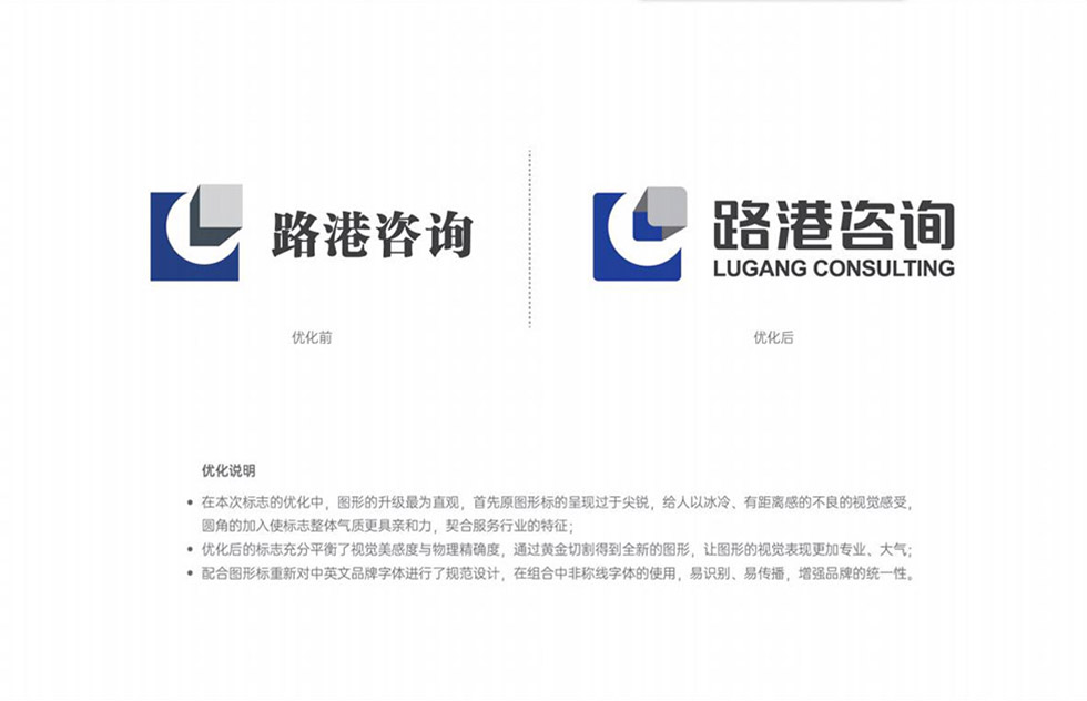 项目背景:湖北路港工程咨询有限公司成立于2001年,是湖北省建设工程造价咨询协会第四届理事会副理事长单位,公司具有中华人民共和国住房和城乡建设部颁发的工程造价咨询甲级资质等多项资质。艾的尔设计承接其品牌VI设计,与客户深入沟通后,明确企业寓意对LOGO设计进行优化,在此标志优化中图形的升级最为直观,原图形标的呈现过于尖锐,给人冰冷的视觉感受,优化后的标志整体气质具有亲和力,契合服务行业的特征,也通过黄金切割得到全新的图形,视觉表现更加专业、大气。