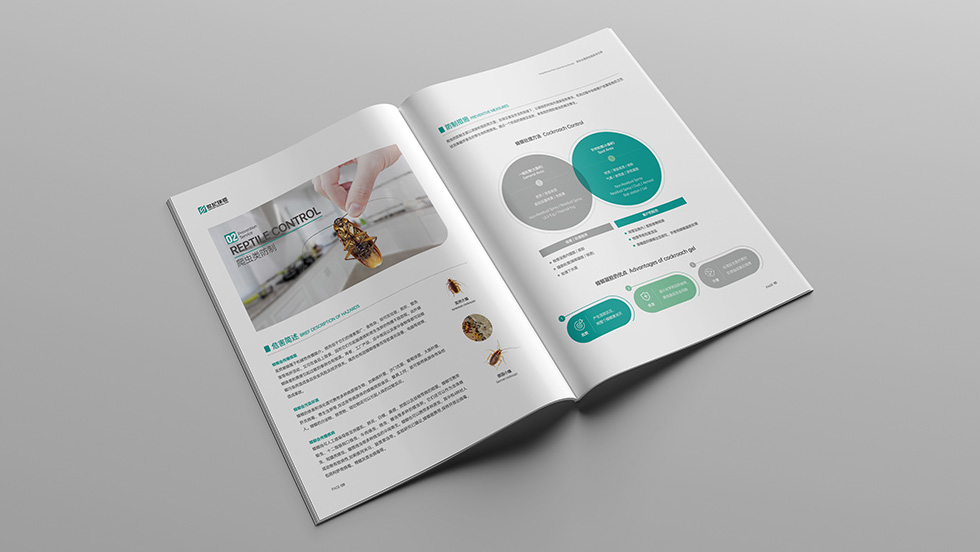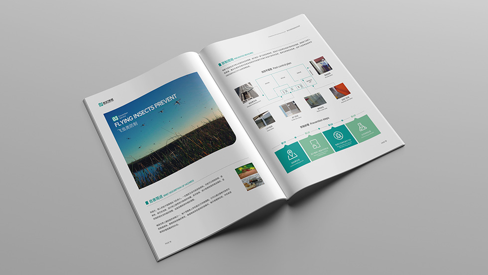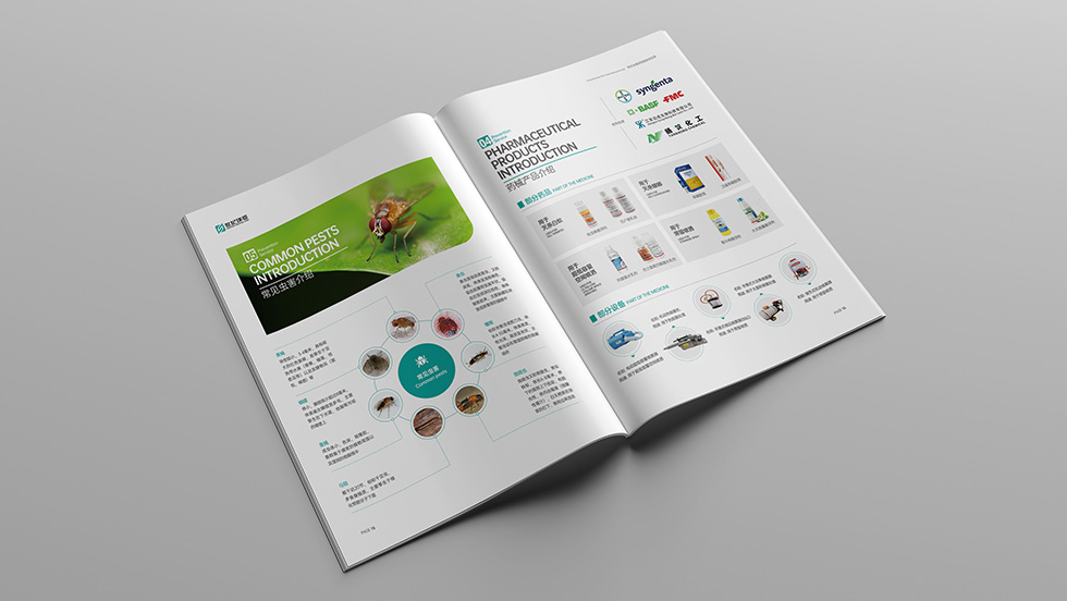 项目背景:世纪环亚是一家全国性集团公司。是中国卫生有害生物防制协会会员单位,以“缔造中国虫害服务优质供应商”为愿景的全国A级虫害服务公司,与德国巴斯夫、德国拜耳、英国先正达等行业巨头建立强强战略合作伙伴关系,公司业务遍及全国上百省市。“资深的专家团队、领先的专业技术、完整的服务方案、先进的消杀器械、优质的跟踪服务”一直是公司的主打品牌,通过多年的实践,用口碑见证了服务效果,用效果见证了专家实力,深受各界好评。艾的尔承接其画册设计制作,成立品牌设计小组,与企业进行深入沟通,明确企业对于画册设计的需求,封面采用大面积留白为主体色,大气简约,字体色和背景图采用生物绿色,凸显主题,行业属性生物防制行业。